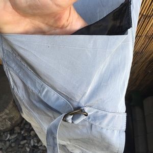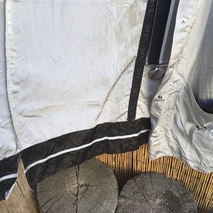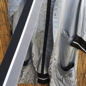 High fashion grey/silver with navy blue trim -snaps up -big pockets in front -2 on each side -matching stretch belt -fantastic jacket can be worn open or belted -matches skirt already posted -can be worn together. One of a kind fashion jacket -with label removed -bought in Paris -size medium to large -will fit most anyone since its loose & open,,,SEE MATCHING SKIRT