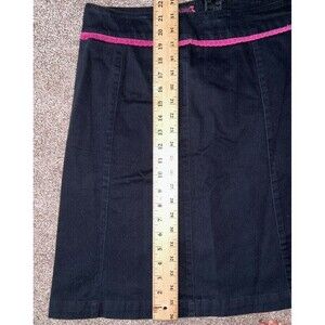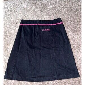 This beautiful black A-line skirt by French Kitty is the perfect addition to any casual occasion. The hot pink lace and embroidery add a pop of color to the solid pattern and the knee-length skirt is made of 100% cotton. The skirt is lined and has a zip closure for easy wear.