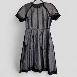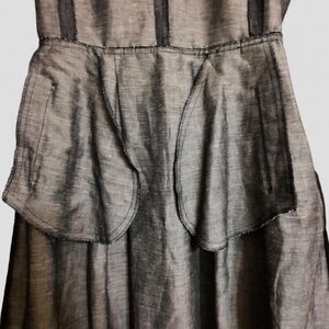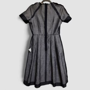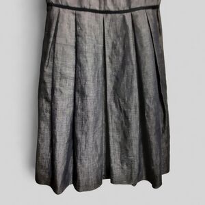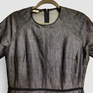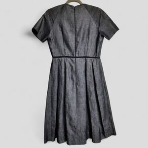 Les Copaines blue/grey chambray dress in size 42IT, 6US. Made in Italy with nice tailoring and attention to detail. A-line fit flare with pleats. Will fit as a knee dress or mini depending on height. Round neck, short sleeves, concealed pockets, rear YKK zipper and grossgrain waist. In a breathable cotton and linen blend. In very good condition.