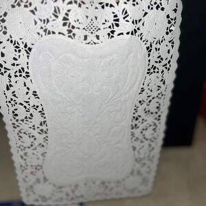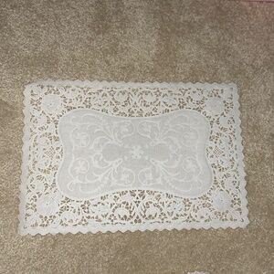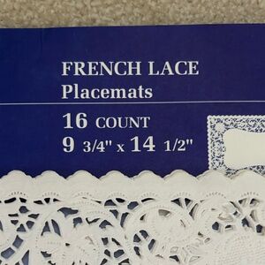 Vintage set of 12 French Lace Placemats 9 3/4" x 14 1/2". Laser cut white paper. Never used, no flaws. Non smoking no pet home.