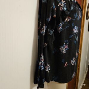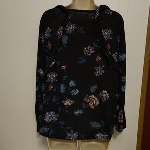 Long sleeves with ruffle collar going down to area between arm pit and waist Black .blue green and red cut outright under neckline 100 % polyester
