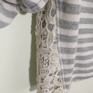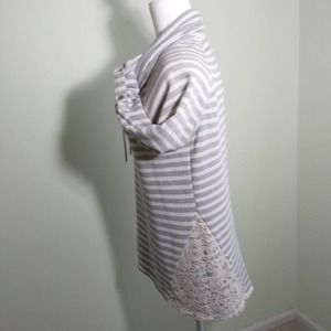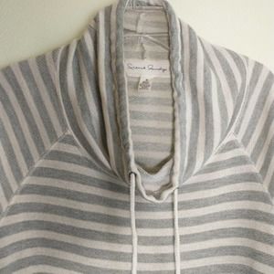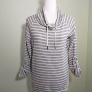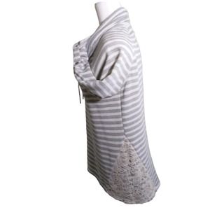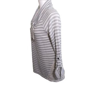 French Laundry Cowl Neck Shirt, Gray /White Striped Terry Lace Trim, button roll sleeves pullover Drawstring at neck sweatshirt top Women's Medium