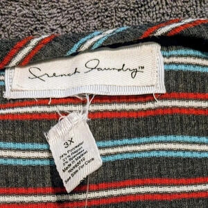 Introducing a stylish French Laundry knit top with a striped pattern in shades of teal, gray, and white. The top features a button-up design and long sleeves, making it a perfect addition to your collection of basic tops. It is made using a combination of spandex and cotton material, ensuring maximum comfort and stretchiness. This top is perfect for plus-sized women, with a size of 3XL. The button accents add a touch of elegance to the overall design. Get this new-with-tags stretchy top to elevate your wardrobe. NWT