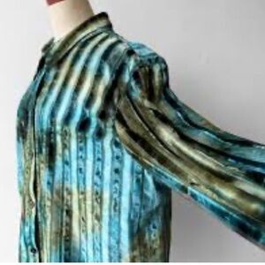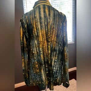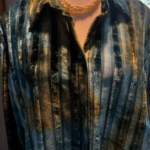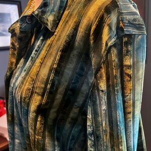 Stylish blouse with vertical stripes. Features a blend of blue, green, and yellow hues. In velour stripes for a rick m roll vibe. Button-up front with long sleeves. Oversized look can be work with any accessory.