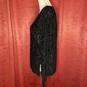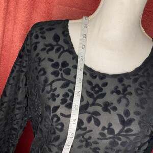 Adorable French Laundry Shirt Women Black Long Sleeve Size Medium, has a kind of Velvet Floral Look. Sleeves are sheer or see through. Please see all photos for condition and measurement, questions and offers welcome! 20" approximately pit to pit and approximately 25" length