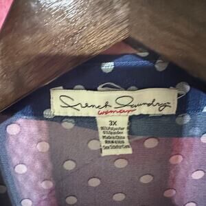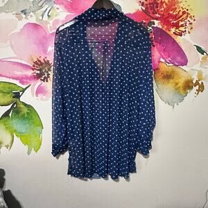French Laundry Womens Top 3X Blue with White Poka Dots Blend Sheer Button up