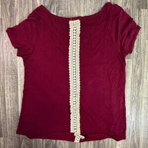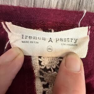 This is a French Pastry (Los Angeles) women’s tee with a bold white elephant graphic and text “Your Vibe Attracts Your Tribe.” The shirt is a rich burgundy / wine color and has a cute crochet lace strip down the back. Short sleeves, casual style. It has been worn and shows normal signs of use but is in solid wearable condition — see photos for details (including any threads, fading, or fabric wear).