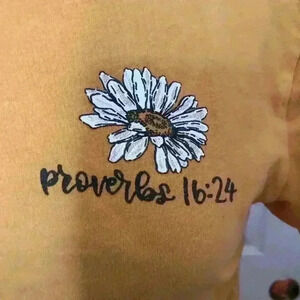 French Pastry gathered scrunched sides yellow Bible quotes short sleeve SMALL