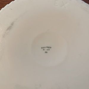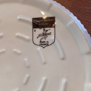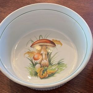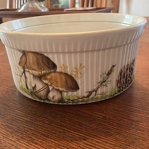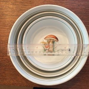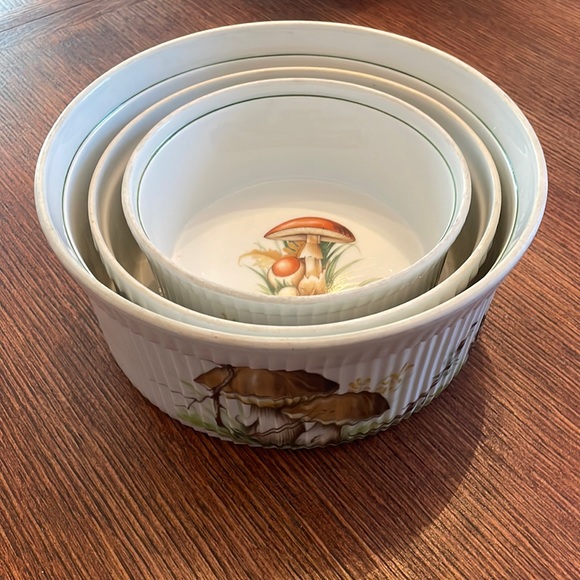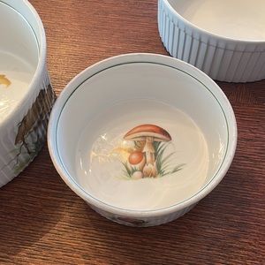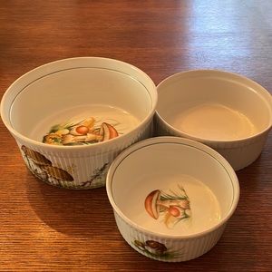 Set of three nesting ramekins. Two are of the Lourioux “LaFaune” mushroom collection. With varied mushroom types. The middle is not part of the set but fits nicely with the others. It is plain white. One small hairline. Hardly noticeable. So pretty and perfect for fall.