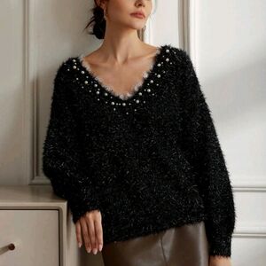 French Romantic Bead & Feather Embellished V-Neck Soft Pullover Sweater