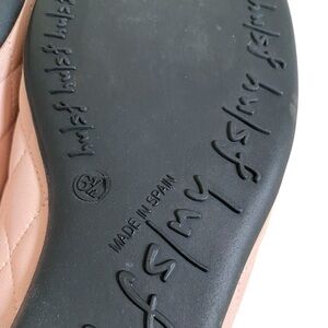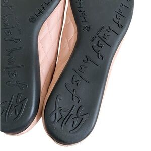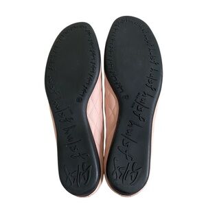 Preowned French Sole NY Passport Rubber Sole Ballet Flats in Blush Quilted Leather with Black Patent Leather Cap Toe. Women’s Size 6.5. Made in Spain.