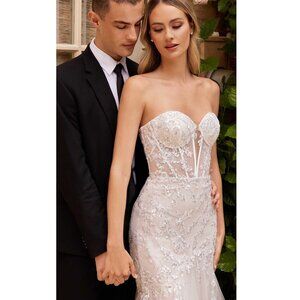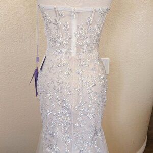 - Is labeled a size 6 but runs small and fits like a size 4 - Approx measurements: - Bust: 34" - Waist (Smallest part of the waist) : 26" - Hips: 36.5" - 57 1/2" front length; 66" back length - Strapless illusion sweetheart neckline bodice with corset boning and bustier cups - Sheer back with a zipper closure - Floor length fitted mermaid skirt with a sweep train - Tulle skirt with glitter underskirt and nude lining.