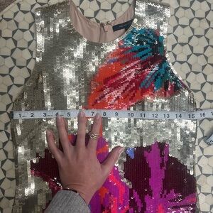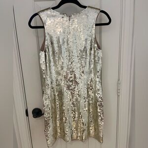 Tags removed but never got a chance to wear, French Connection gold sequin dress with bright floral details on the front of the dress. Sleeveless. Back hidden zip. Fully lined. Stunning dress. Sz 0.
