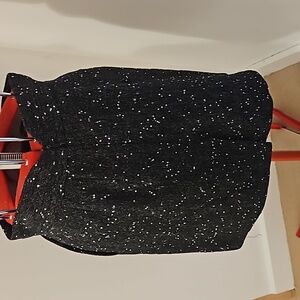 straight black with white speckles wool skirt. black button details. hidden front pockets in the pleated detail