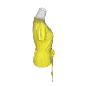 French Connection Angora & Lambswool Short Sleeve Sweater Top. Very soft and feminine. Features a extra long wrap around tie at waist. Embroidered knit design on left chest. Please note that the color is a slightly softer yellow that is hard to capture true to life in photos with lighting. Not as bright as in pictures. Machine wash cold.