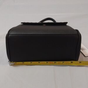 Mini crossbody bag, with top handle. All vegan leather, with silver toned stud accents. Front magnetic snap button closure. Opens to one main compartment, with blue logo lining. 1 inner coin zipper pocket. The back has 1 open slot compartment. Comes with a detachable, adjustable, crossbody strap, which is still in its wrapping.