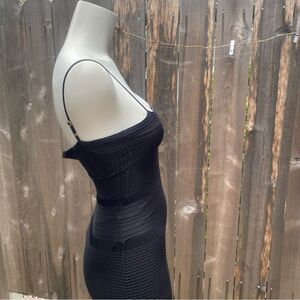 This stunning black maxi dress by French Connection is designed for a night out or cocktail event. Featuring a ruched bodycon silhouette with spaghetti straps, it offers a sleek and sophisticated look. The sleeveless design enhances its elegance, making it a perfect choice for any special occasion. Zipper in the back