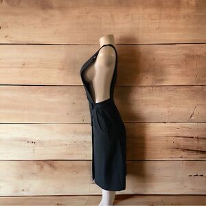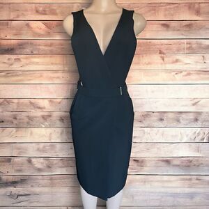 Thick crossover straps. Concealed popper fastenings at waist with exposed metallic bar detail. Wrap-over skirt with curved side pockets