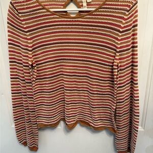 Stylish long sleeve top with red, white, and tan stripes. Perfect for casual wear. A great talk to layer up in the fall Derr soft and comfy. Absolute condition, no pulls, tears, or stain. Measurements. Pit to pit is 15 3/4 inches from the top of the shoulder to the bottom of the tea is 20 1/2 inches from the armpit to the bottom of the sleeve is 16 1/2 inches