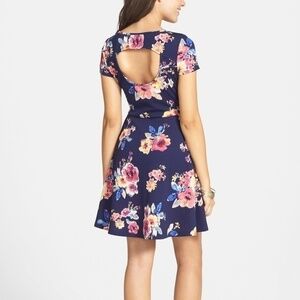 A painterly floral print colors a cute short-sleeve skater dress styled with a scooped neckline, swingy skirt and a back-baring keyhole.