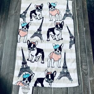 NWT French Bulldog Paris / Eiffel Tower print hand towels set. Includes 2 standard size hand towels. Tan / gray / taupe and white striped background. May have multiple sets & sizes available, please ask if interested in bundling.