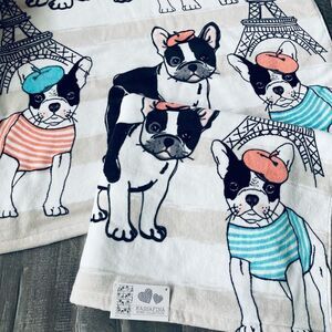 NWT French Bulldog Paris / Eiffel Tower print bathroom towels set. Includes 2 large standard size bath towels. Tan / gray / taupe and white striped background. May have multiple sets & sizes available, please ask if interested in bundling.