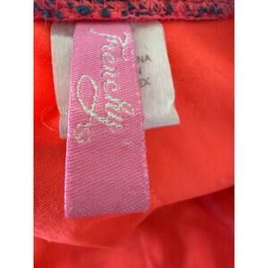 in excellent pre-owned condition. Adorable two-piece bikini ffeaturing a steel gray crochet overlay with vibrant neon orange lining. Very eye-catching.