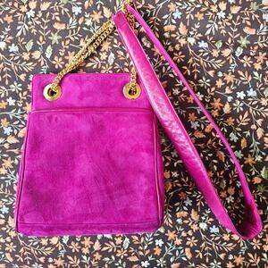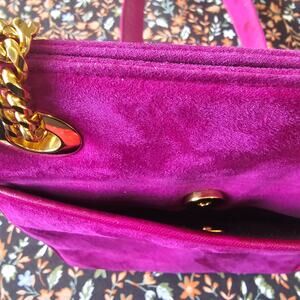 Excellent condition. Very vibrant purple plum color with gold hardware. Magetic button closure. Two inside pockets. The only flaw is discoloration on the strap (pictured).