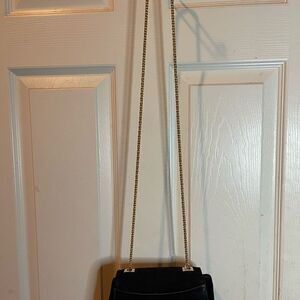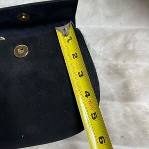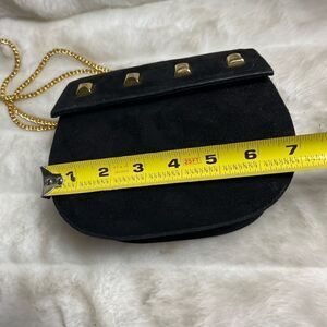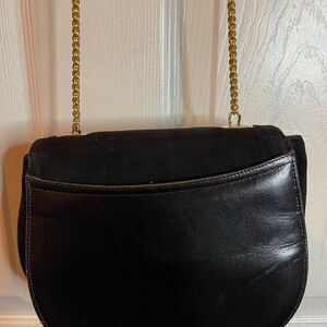 Frenchy of California vintage black suede & leather shoulder bag ,gold tone studs accents and chain strap.attached by toggle,back pocket flap top snap closure the inside lining has a side zipper and a side pocket pre owned in good used condition see all pictures any questions please message.