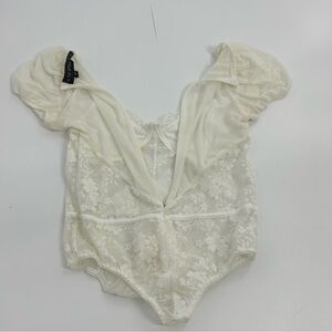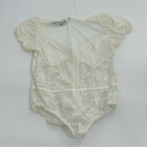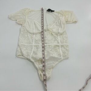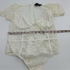 Frenchy style 90s Y2k White Lace Corset Short Sleeve Sleeve Bodysuit Back Zip 14. Ethereal Fairy romantic grunge top. In excellent pre-owned condition. Gives a push up bustier fit. Stock photo shown for style purposes only not original item.