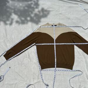 Frenckenberger chalk and tan bi-color boyfriend sweater with wide raglan sleeves in mid-weight pure cashmere. This pullover features an upper cream panel with a lower cinnamon brown panel separated with a v design. Rib trim finishings at the neckline, sleeve cuffs and hem. Slightly oversized fit. Item is in excellent pre-owned condition; worn twice and dry cleaned. No flaws. There is some felting that occured with normal wear / dry cleaning but no pilling. Size Small. Amadiah is 5'9" (175 cm), bust 32", waist 24", hips 34" and wears a size Small. Designer Colorway "Up Chalk/Under Tan". Retailed for $750. Please note: Knit items are stored with sachets made from natural lavender and rosemary sprigs; please note if you are sensitive as this may carry the light scent of these plants.