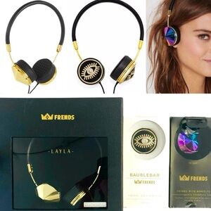 NWT Frends Gold Layla Headphones with 2 Bonus Caps Sets - the special edition Baublebar crystal eye cap set + oil slick rainbow cap set.