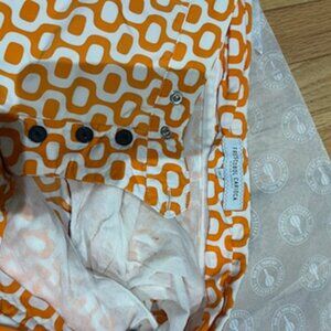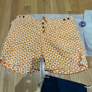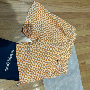 Slightly used men's Frescobol Carioca Men's Bathing Suit - Size 34 - Orange pattern on a White Background - in great condition and comes with its own little bag for travel