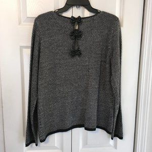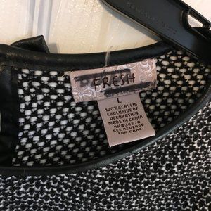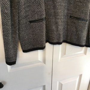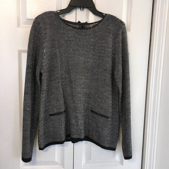 Very nice Fresh black/white tweed sweater with faux leather neck trim, pocket trim (pockets are decor only) and 3 faux leather bow ties on back of sweater, super cute and lightweight.