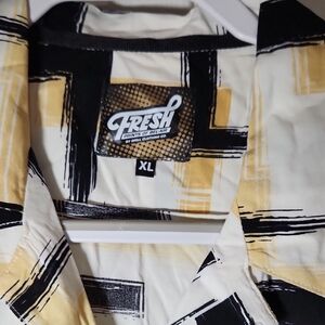 This stylish shirt from Fresh showcases a bold geometric design in black and tan, perfect for adding a modern touch to your casual wardrobe. Crafted from lightweight material, it offers comfort and breathability for everyday wear. The unique pattern gives it a retro flair, making it a standout piece for any relaxed occasion.