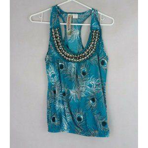 This is for a used Fresh Brewed Women's Blue Studded Tank Top With Peacock Feathers Design Small.
