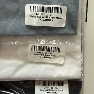 Set of Fresh Clean Threads T-shirts in charcoal, navy, white, and gray. Comfortable basics.