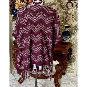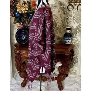 Fresh Fringed Zig Zag Shawl Poncho Wrap Sz Large Southwestern Boho Chic Burgundy
