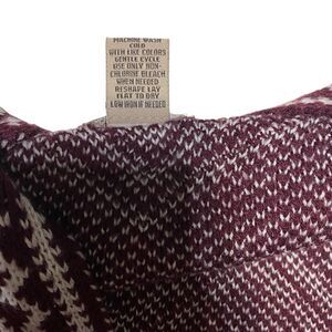 Introducing the Fresh Women's Fringed Zig Zag Shawl Poncho Wrap in size large. Made of 100% Acrylic. This versatile poncho is perfect for any occasion and features a unique zig zag pattern in burgundy and white colors, adding a touch of boho chic to your outfit. The poncho has a shawl collar style and is designed with fringe accents, giving it a playful and stylish look.