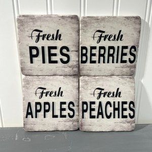 Fresh Fruit Square Stone Coasters Set of 4 New In Box Cork Bottom For Protection Apples, Berries, Pies, Peaches