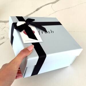 Fresh gift box with ribbon 6.5” by 6.5” by 3.5”.