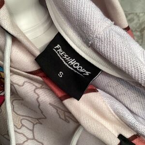 Fresh Hoods is a clothing brand that sells apparel with all-over prints, including the hot air balloon and world map design featured in the image. The hoodie is known as the "Balloon Land Cropped Hoodie" or the "World Travel Women Hoodie".