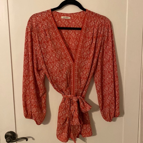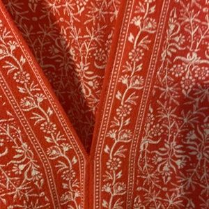Fresh looking reddish-coral top with white pattern. Self belt that ties in front.Cinched in at waist. Great for traveling as it’s hard to wrinkle!