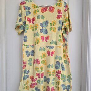 100% cotton yellow dress with colorful butterflies. A line (with fuller skirt) dress with 2 front pockets, V-Neck, short sleeves, no zipper or buttons, just put it on and go! Size medium, Gently worn, pre-owned dress is in great condition, no rips or stains. Cold water wash and hang dry or low heat dryer.