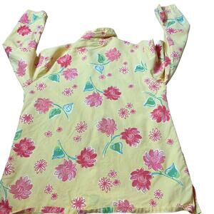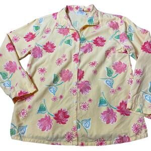 Paula Prentiss button down shirt, floral print blouse, yellow long sleeve top, pink flower print shirt, retro floral button front blouse, casual lightweight shirt, size small women’s blouse, spring summer floral shirt, vintage inspired floral top, breathable cotton shirt.