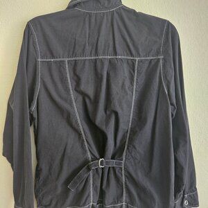 This black jacket is adjustable and very lightweight perfect for the spring. The fabric is soft and stretchy and there are pockets for convenience. There's an adjustable part in the back that makes it easy for a good fit