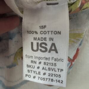 Fresh produce size large made in USA women's blouse Hawaii tropical print ocean sea floral hibiscus flamingo 100% cotton style 22105 can be worn as a shirt or a cover up. long sleeve multicolor blue, pink, green white length 32 pit to pit 21 in. Excellent condition!