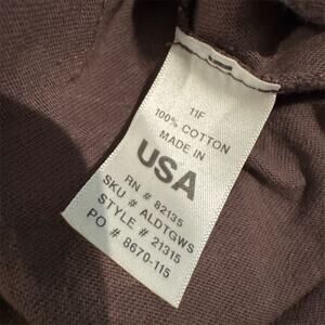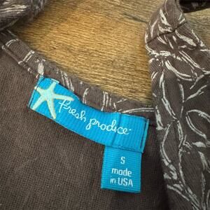 Keywords: Fresh Produce, casual sundress, swingy dress, midi dress, brown dress, white leaf pattern, summer dress, cotton dress, machine washable, women's dress, USA made, size S, regular fit, pre-owned dress.