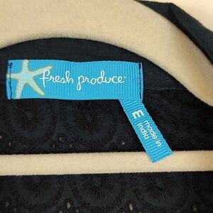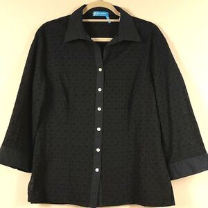 Fresh Produce Alseyel Eyelet Embroidered Button Front Blouse in Black. This cotton blouse features 3/4 length sleeves, eyelet embroidery, collar, side slits and mother of pearl buttons. 100% cotton. Size Medium.