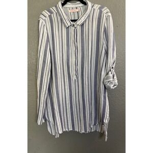 Keywords: striped tunic, roll tab sleeves, womens blouse, Fresh Produce, XL, XXL, plus size, button down, casual top, summer top, vacation wear, striped shirt, long sleeve tunic, relaxed fit, blue and white